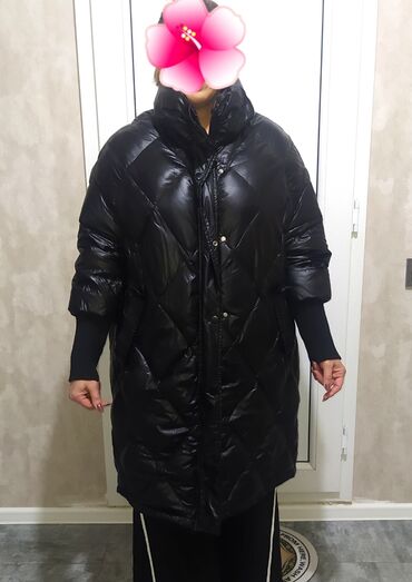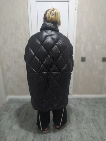Qadınlar üçün uzun, qara rəngli qışlıq pufik palto.