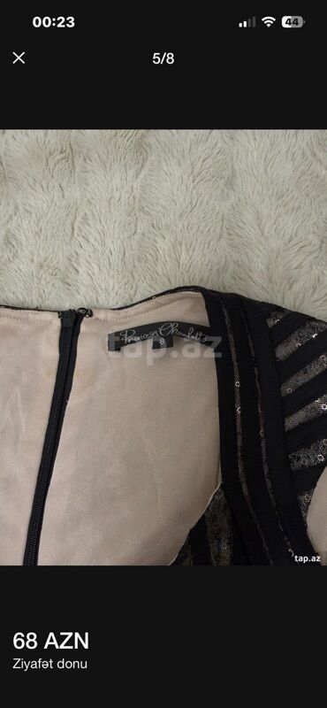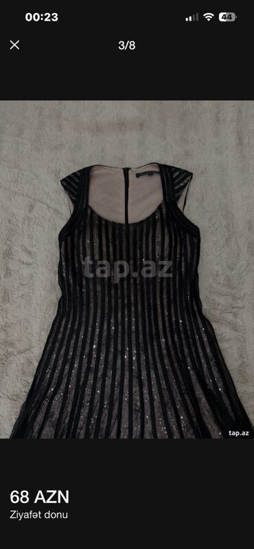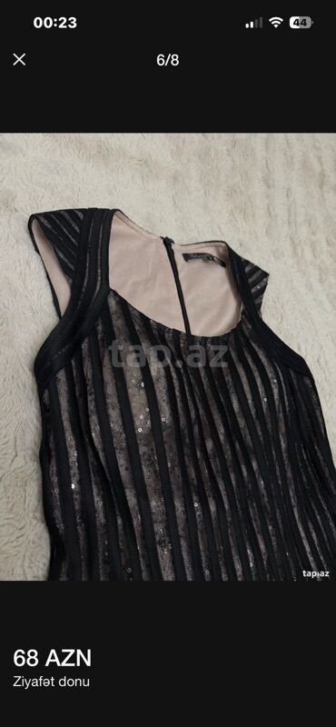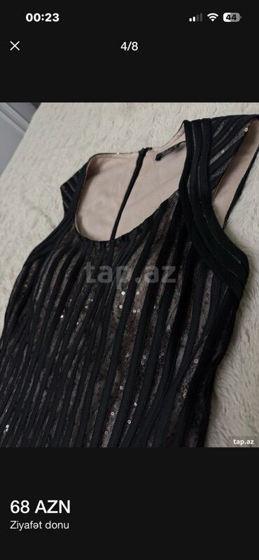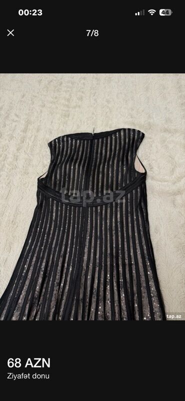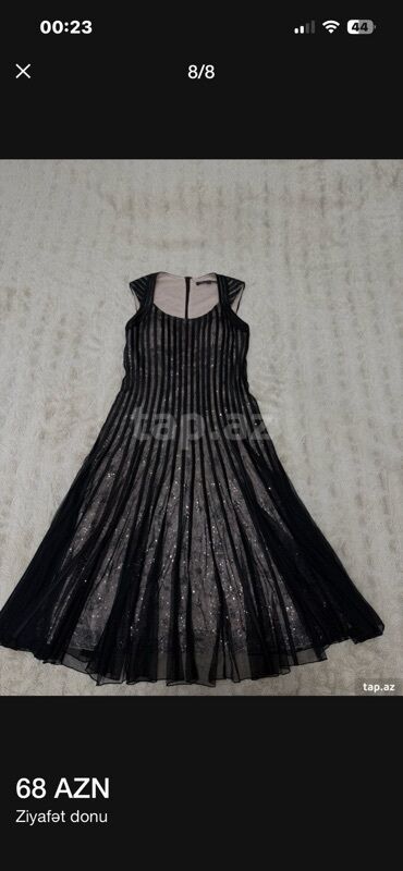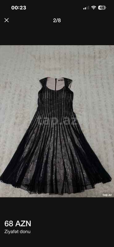 Razmer 38-40 1 dəfə geynilib 300 manata alinib Qara rəngli, uzun axşam geyimi. Tam boy payetlərlə bəzədilib, zolaqlı parıltı effekti verir. V-yaxa, uzun qol, ön hissədə drapirovka və yığma düyün de...