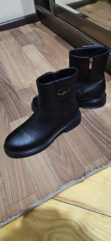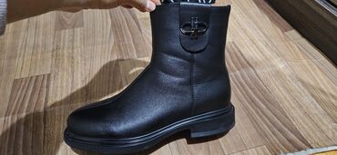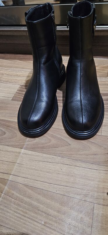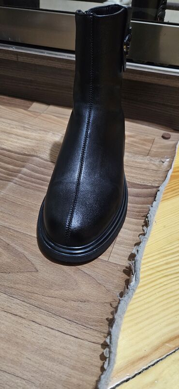 Qadın üçün qara qış botları - Material: yumşaq süni dəri görünüşlü üst, iç hissəsi isti astarlı - Rəng: qara, mat-parlaq effekt - Dikdaban: qalın və sabit blok daban (təxmini 7–9 sm), qaba hissə p...