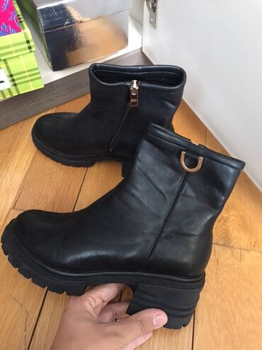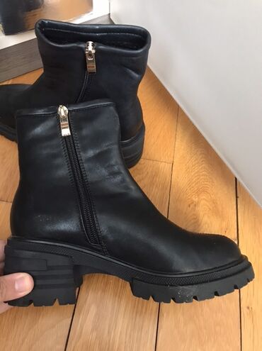 Qadın qısa çəkmələri - Rəng: qara, laklı parıltı - Model: qısa booti (ankle boot), yumru burun - Material: parlaq süni dəri (lak effektli) - Bağlanma: yan hissədə fermuar, arxa tərəfdə tənzimlənən...