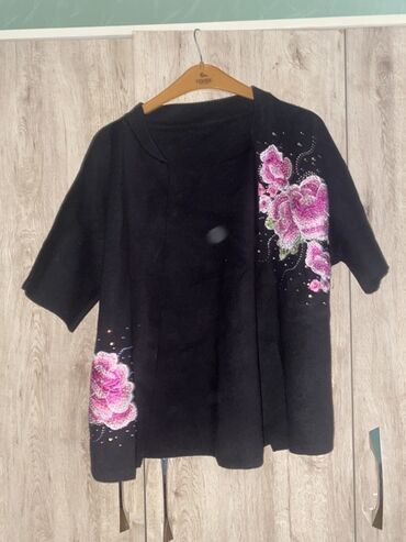Naxışlı qadın kardiganı. Qara rəngdədir və üzərində güllü naxışlar var. Naxışlar qızılı və qəhvəyi tonlarda, kiçik daşlarla bəzədilib. Kardiganın açıq yaxalığı və uzun qolları var. Çiyinlərdən aşağ...