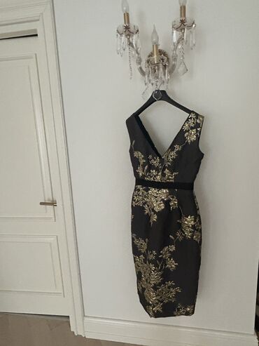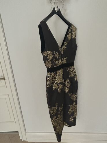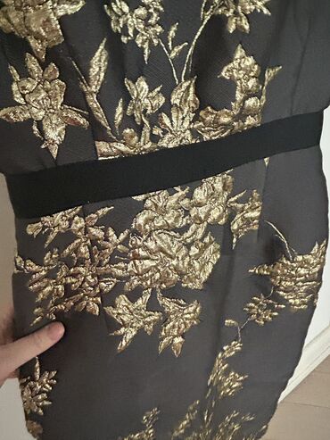 Qızılı rəngli, parıltılı kokteyl/ziyafət donu Əyin gözəl oturur. - Model: qolsuz, yuxarı hissəsi bədənə oturan, A-kəsim ətək - Boyun xətti: klassik yuvarlaq - Material: metallik parıltılı kumaş (şi...