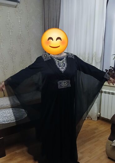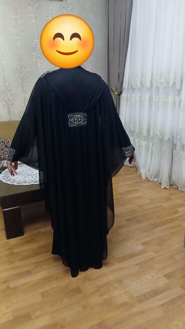 Qara rəngli, uzun və geniş kəsimli abaya/plaş tipli qadın geyimi. Məkkədən alınıb .Yüngül, axıcı parça ilə hazırlanıb, qolları bol və rahatdır. Sinə hissəsində V-kəsim qatlı dizayn var. Boyun, çiyin, bel və qol uclarında gümüşü bəzək daşları və naxışlı aplikasiyalarla zənginləşdirilib; bel hissəsində dekorativ bəzək paneli silueti vurğulayır. Klassik, zərif görünüşü ilə məclislər, mərasimlər və gündəlik örtülü tərz üçün uyğundur. Rəng: saf qara. Uzunluq: ayaqyoluna qədər. Detallar: - bəzəkli yaxa və çiyin panelləri - bəzəkli bel paneli - bəzəkli manjetlər - axıcı, örtücü kəsim.