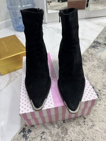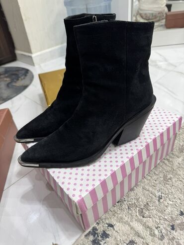 Qara rəngli qısa xanım çəkmələri - Material: dəri təsvirli üst hissə, möhkəm rezin altlıq - Rəng: klassik qara - Dizayn: yumruya yaxın uclu burun, orta hündürlüklü kvadrat daban - Bağlanma: yandan...