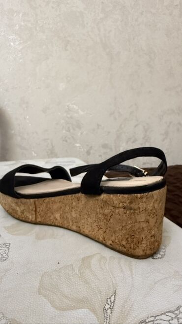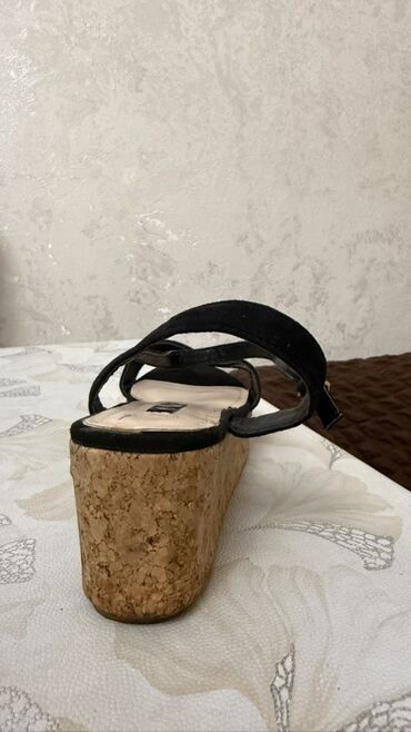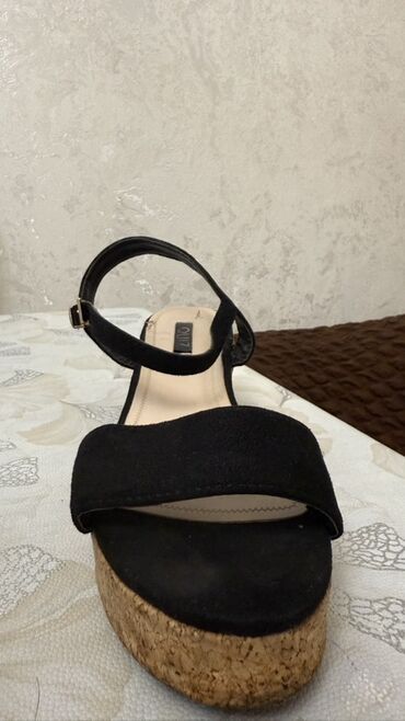 Zərif qadın platformalı sandal – iki rəngli dizayn - Üst hissə: qara süet-look material, açıq burun - Arxa hissə: qızılı rəngdə qalın kəmər və metal toka ilə tənzimlənən qayış - Daban: stabil, hünd...