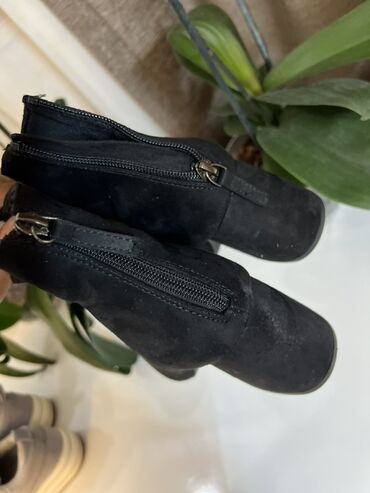 Qadınlar üçün qara botlar - Material: zərif süet toxumalı üst. - Rəng: mat qara. - Model: qısa boyunlu, yumru/oval burun. - Daban: stabil kvadrat daban, orta hündürlük (gündəlik və axşam geyimi üç...