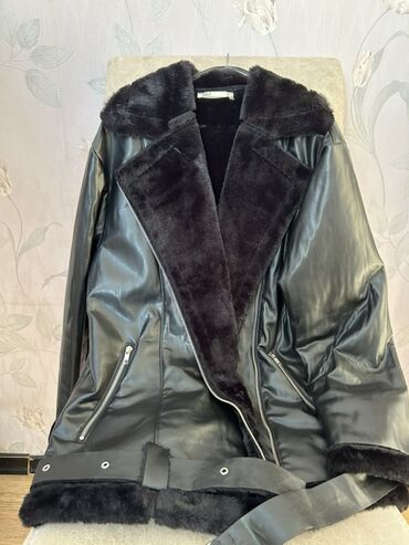Qara rəngdə isti qış gödəkçəsi – süni dəri görünüşlü üst material və iç tərəfi tam xəz (plyuş) ilə örtülmüş. Oversize/aviasiya üslubunda kəsim, geniş xəzli yaxa və qalın xəzli manjetlər. Asimmetrik...