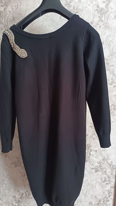 Qara klassik qadın donu L razmer - Rəng: tam qara - Kəsim: yüngül dar, dizə yaxın uzunluq - Yaxa: V formalı, xırda bəzək daşları/boncuklarla işlənmiş - Qol: qısa qol - Material: nazik, elastik tri...