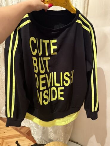 - Sweatşört: ön hissədə iri “CUTE BUT DEVILISH INSIDE” yazısı; çiyin və qollarda ikiqat neon-sarı zolaqlar; alt hissədə neon-sarı qatlı effekt; manjetli qollar