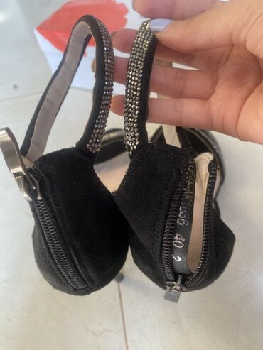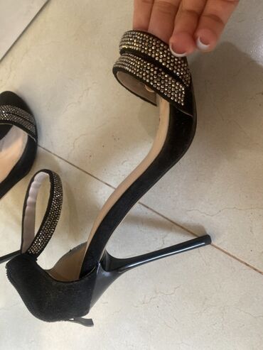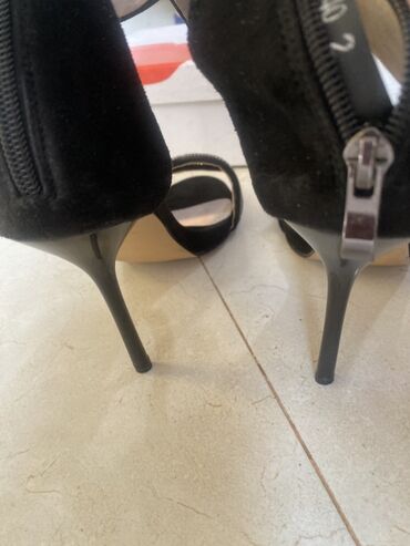Qara qadın sandaleti – hündürdaban - Rəng: qara - Model: çox zolaqlı, önü açıq, dabanı incə stilettO tipli - Bağlanma: arxa hissədə fermuar (rahat geyinib-çıxarmaq üçün) - Material: süet effektili...