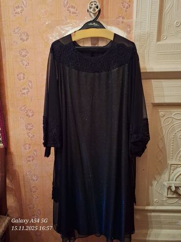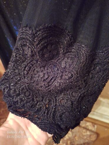 Qara ziyafət/libas - Model: dizdən aşağı uzunluqda, V-şəkilli dərin dekolte - Parça: krujeva fakturalı üst, parıltılı/payetli işləmələr - Qol: şəffaf tül uzun qollar, manjet hissəsi krujeva detalı...