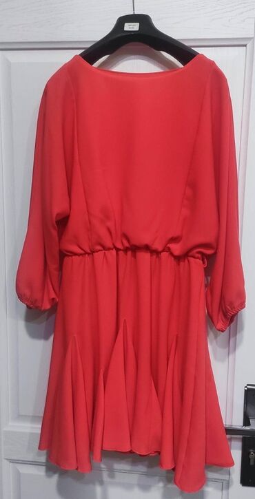 Qırmızı rəngli, yarpaq printli uzun yay donu. - Ölçü: S - Qiymət: 62 AZN (şəkildə göstərilib) - Model: kvadrat yaxalı, qısa həcimli (buf) qollar, beldən yığılmış, pilləli ətək kəsimi - Parça: yüngü...
