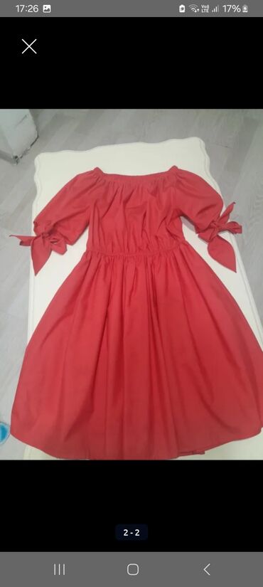 Qırmızı qadın donu 36-38 beden uygundur cox az geyinilmisdir - Model: qısa, alt hissəsi dalğalı/volanlı ətək - Yaxa: kvadrat kəsim - Qol: uzun, yüngül şəffaf effektli; manjetlər genişdir və dekora...