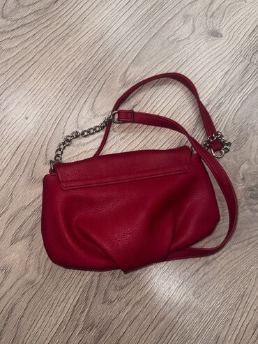 Qadın çantası – tünd qırmızı rəngdə, qranul teksturalı eko‑dəridən. - Çiyin/kross-bodi üçün uzun qayış: bir hissəsi zəncir, bir hissəsi tənzimlənən dəridir. - Üst hissədə dekorativ qara metal düymə...