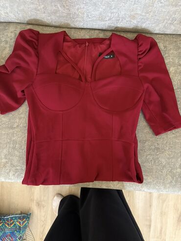 Qırmızı rəngdə zərif ziyafət/libas 1ce defe geyinilib - Model: bədənə oturan midi don - Rəng: parlaq qırmızı - Üst hissə: düz kəsim, kvadrat yaxalı - Qol: şəffaf tül uzun qollar, manjet hissəsində...