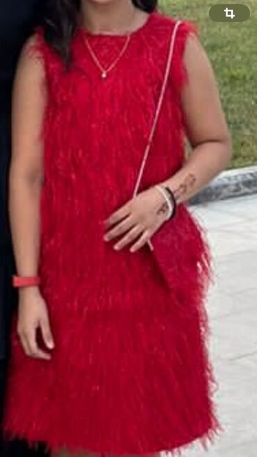 Qırmızı rəngdə, qolsuz, tüklü materialdan hazırlanmış, dizdən yuxarı uzunluğa malik qadın donu. Dairəvi yaxalıqlı və düz kəsimli bu don, xüsusi günlər və ya dəbli görünüş üçün uyğundur. Tüklü teksturası ona zərif və fərqli bir görünüş verir. Rahat və yüngül materialdan hazırlanmışdır. Gəzintilər, partilər və ya gündəlik istifadə üçün uyğundur.