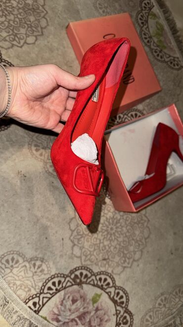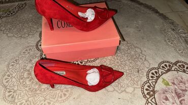 Qırmızı rəngli qadın klassik tuflilər - Brend etiketləri: “Sasha Fabiani”; qutuda “COMFY BRAND” yazısı - Material: zərif süet teksturası - Burun forması: iti/şpilka stili - Üst hissədə iri dekorat...