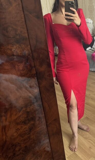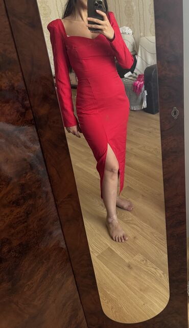 Qırmızı axşam/gecə geyimi. Yalniz whatsapp - Material: yumşaq, parıltılı məxmərə bənzər parça - Rəng: zəngin al-qırmızı - Dizayn: tam uzunluqda, bədənə oturan siluet, ön və yan hissələrdə bol drap...