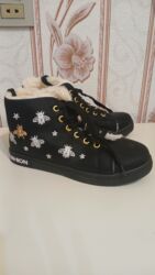 Qara rəngli qadın qış ayaqqabısı/sniker. Orta hündürlükdə, kordonla bağlama. Üst material dərimsi (eko-dəri görünüşlü). Daxili yumşaq süni xəz/isti astar, krem-ağ rəngdə. Qalın rezin daban sürüşməyə qarşı naxışlı altlıqla. Qızılı rəngli deşik halqalar, yan hissələrdə arı və ulduz naxışları, kənarda “FASHION” yazısı ilə dekorlanıb. Soyuq hava, gündəlik geyim və şəhər gəzintisi üçün uyğundur. Şıq görünüşü və isti astarı ilə həm rahat, həm də gözoxşayan seçimdir.