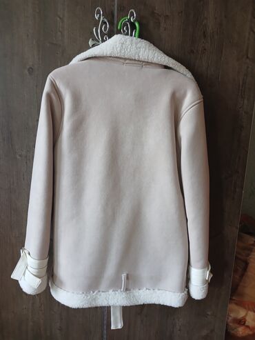 Ağ rəngli süni xəzli, açıq bej rəngli qadın qış jaketi. Geniş, açıq yaxası və asimmetrik fermuarı ilə fərqlənir. Yaxalıq və manjetlər süni xəzlə işlənmişdir. Ön tərəfində iki fermuarlı cib var. Bu jaket sərin havalar üçün uyğundur.