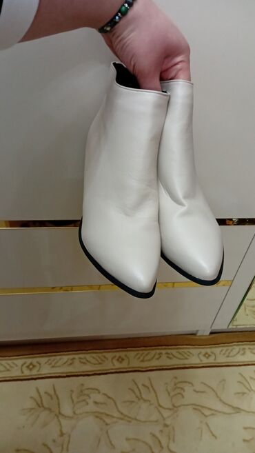 Ağ rəngli qadın botları - Model: ankle booties (qısa boğaz) - Material: yumşaq dəri/eko-dəri görünüşlü üstlük - Rəng: süd-ağ/ivori - Burun forması: yumru - Daban: yüksək nazik stilet (təxmini 10–11...