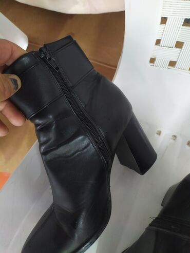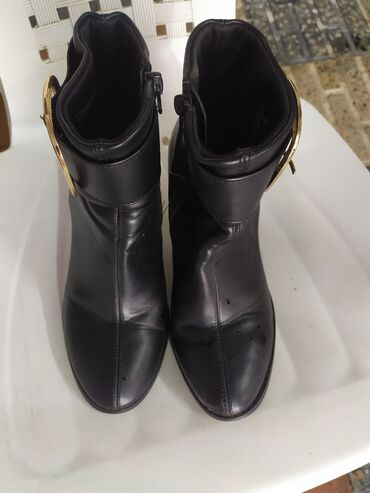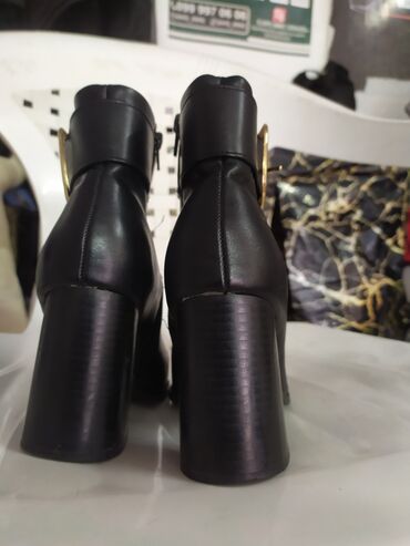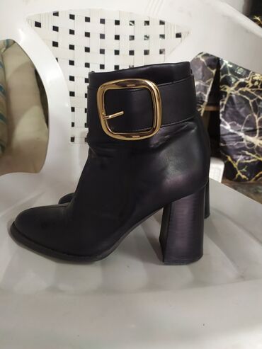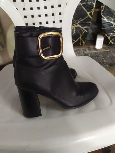 Şəhər stilinə və ofis geyiminə uyğun, klassik qara rəngdə, iri qızılı toka ilə vurğulanmış elegant booti. Şalvar, ətək və paltarla asan kombinlənir; qalın blok daban sayəsində stabil və rahat addım təmin edir. 36–37 ölçüyə yaxın (təxmini).