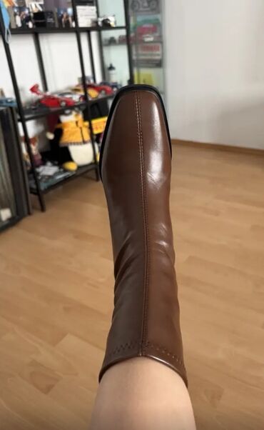 Qadın botları – qəhvəyi süet material, nazik daban (təxminən 5–6 sm), iti burunlu, yan hissədə fermuarlı. Klassik və gündəlik kombinlərə uyğun, payız-qış mövsümü üçün rahat model. Ölçü: 39,5. Şəki...