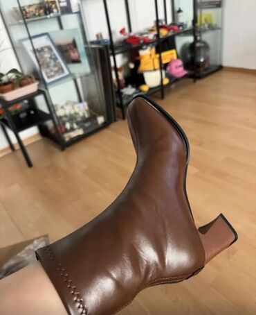 Qadın botları – qəhvəyi rəngdə, dizaynı minimal və zərif. - Material: hamar dəri tipli üst (şəkillərdə mat-parlaq faktura). - Model: qısa ayaq biləyi hündürlüklü, yumru burun. - Daban: sabit, kvadr...
