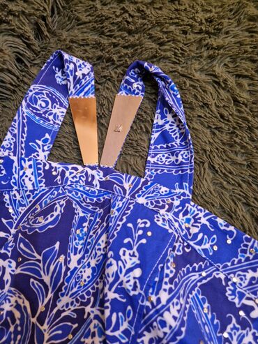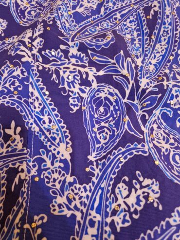 - Rənglər: tünd mavi fon üzərində açıq krem və mavi floral-ornamental print