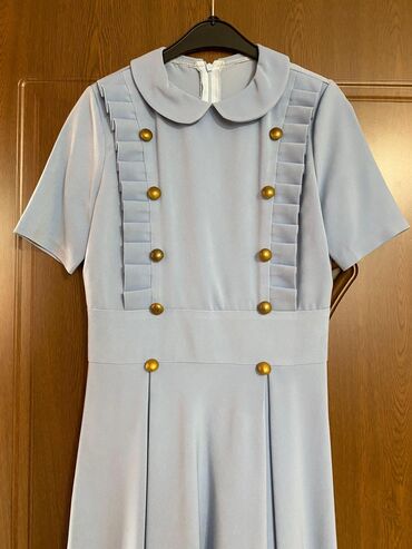 Endirimsiz( 1-2 dəfə geyinilib ) Mavi rəngdə, qısaqol don. Ön hissəsində iki sıra qızılı düymə və hər tərəfində iki şaquli büzməli panel var. A kəsimli ətəyi rahat hərəkət azadlığı təmin edir və beldən aşağıya doğru genişlənir. Gündəlik istifadə və ya xüsusi tədbirlər üçün uyğundur.
