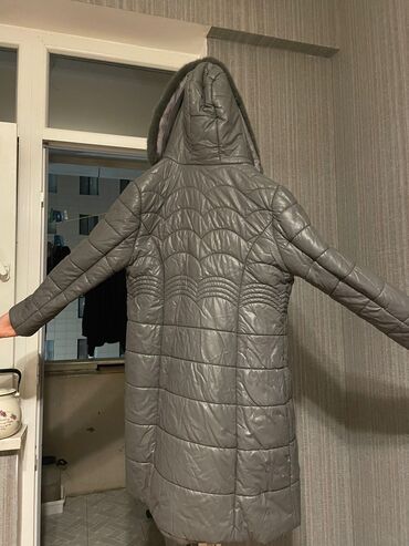 Qadın qış palto-kurtkası - Rəng: boz/metalik - Model: dizaltı uzunluqda, A-kəsim siluet - Material: parıltılı, suya və küləyə davamlı toxuma (yastı tikişli, quilted) - Qapama: iki tərəfli fermuar ...