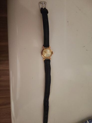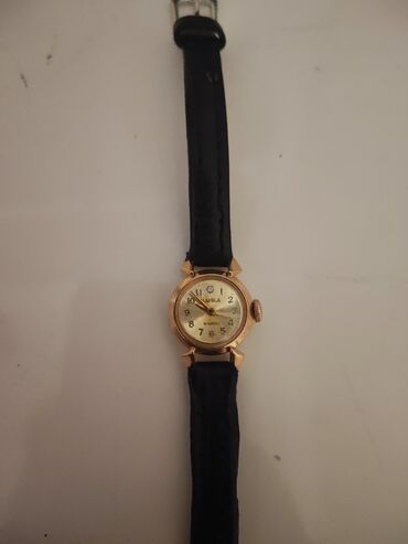 Dəyirmi qədimi rus qızıl korpuslu və qara dəri qayışlı qadın qol saatı. Saat ağ rəngli siferblat və qızılı rəngli rəqəmlərlə tamamlanmışdır. Bu saat dəbli görünüş və funksionallığı özündə birləşdirir, gündəlik istifadə və ya xüsusi hallar üçün uyğundur.
