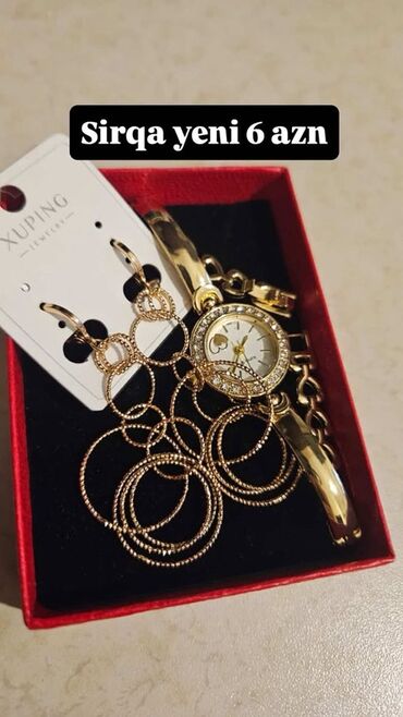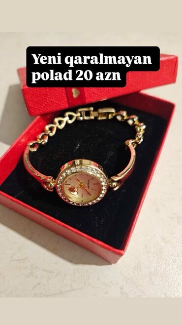 - Qadın qol saatı – poladdan, qaralmayan örtüklü, dairəvi çərçivə və bəzək daşları ilə. Qırmızı hədiyyə qutusunda. Qiymət: 20 AZN.