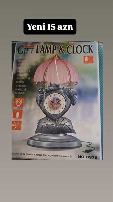 - Hədiyyəlik masaüstü lampa və saat (Quartz). Qutuda, şarj/adapterlə işləyir (şəkildə kabel görünür). Dekorativ gül motivli dizayn, çəhrayı abajur. Qiymət: 15 AZN.