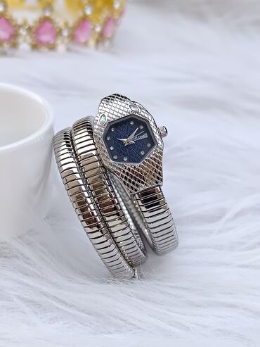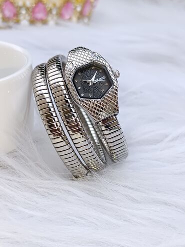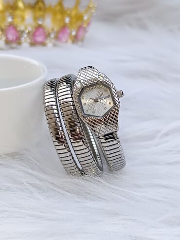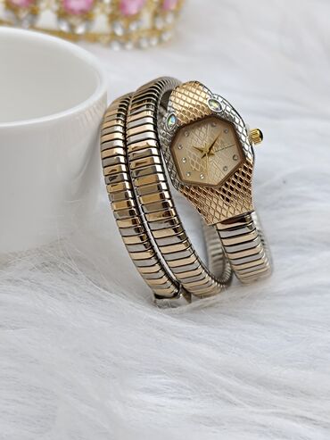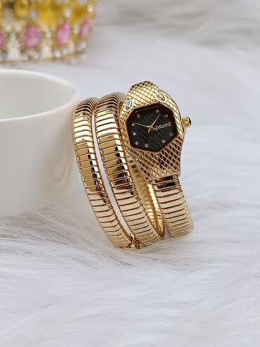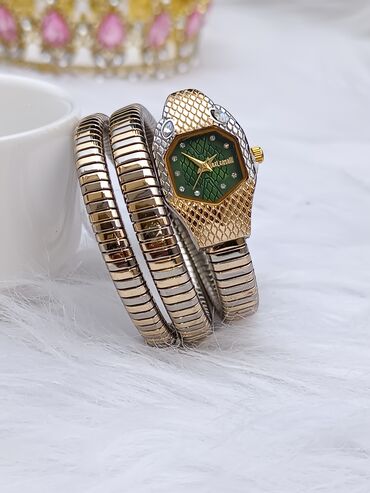 Just Cavalli qadın saatı – zərif “serpantin” dizaynlı qolbaq-saat •KORPUS VƏ QOLBAQ: qızılı rəngli metal, elastik spiral (wrap) qolbaq konstruksiyası – biləyə bir neçə döngə ilə oturur •KADRAN FORM...
