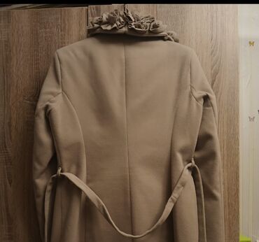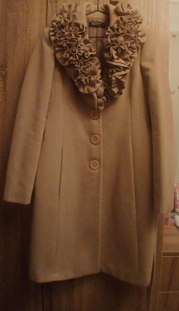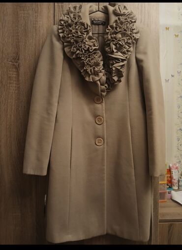 Şıq və feminen görünüş üçün klassik bej rəngdə, volanlı yaxası ilə diqqətçəkən palto. Şəhər və ya ofis üslubuna asan uyğunlaşır.