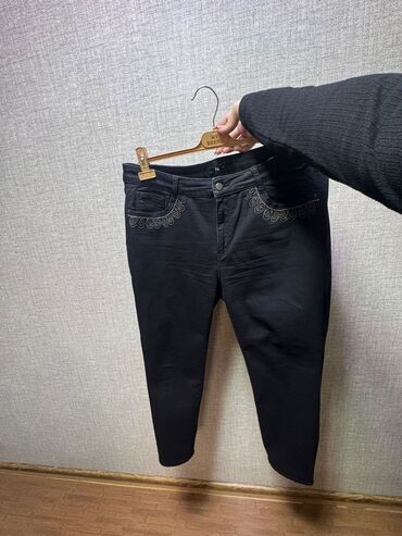 - Model 2: Qara cins şalvar, “5‑cib” dizaynı. Ön ciblərin kənarında naxışlı bəzək. Düz balaq, dar siluet. Dəstəkləyici elastanlı parça hissi.