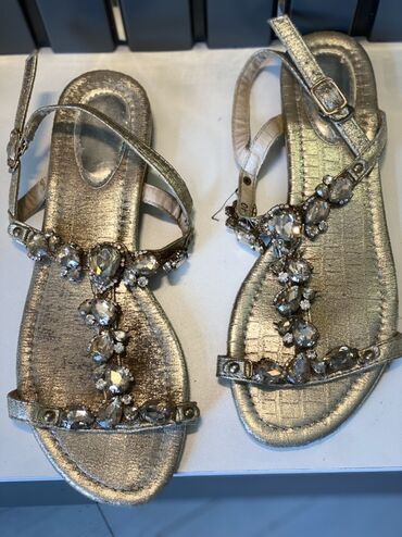 Qızılı rəngli, daşlarla bəzədilmiş qadın sandalları