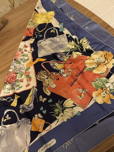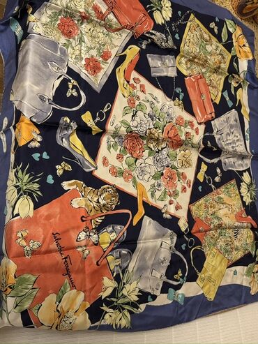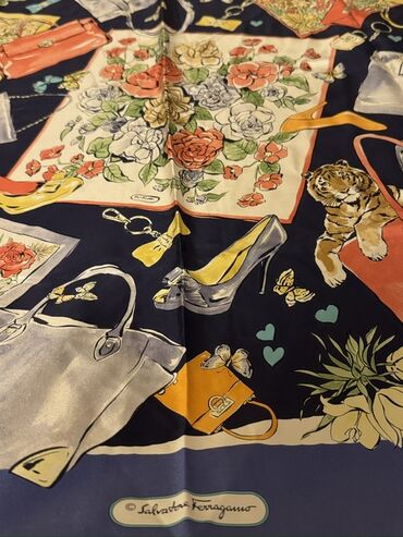 - Naxış: Ferragamo stilinə xas illüstrativ print – güllər, kəpənəklər, pələng fiquru, hündürdaban ayaqqabılar və müxtəlif çantalar; kənarlarda zərif rəng keçidləri
