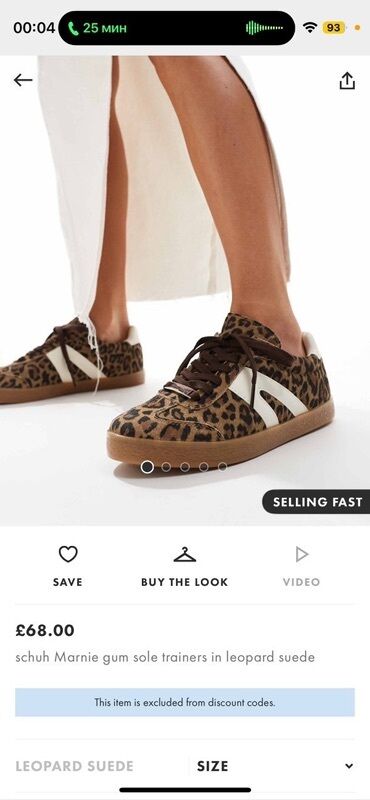 Şəkildə göstərilən modelin mağaza adı və təsviri: “schuh Marnie gum sole trainers in leopard suede”. Qiymət vizualda: £68.00.