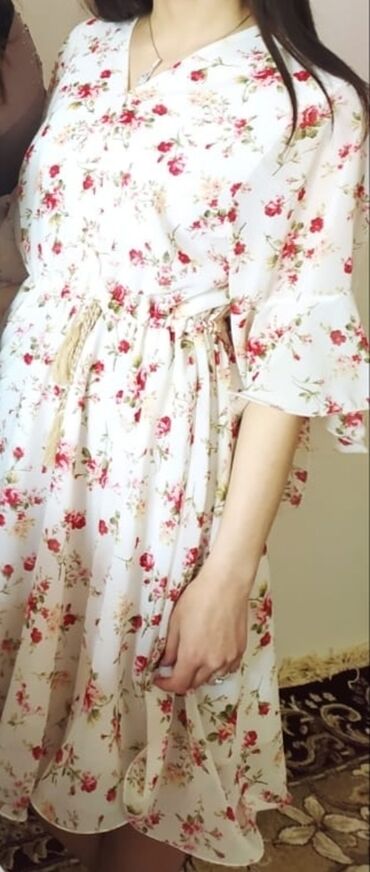 Xanım üçün yumşaq, dartılan materialdan ağ rəngli, üzəri güllü naxışlı dizdən midi yay donu. İçi astarlıdır, arxada kiçik razrezi var. 38 razmer. 36/38/40/42 razmerlərə rahat olur. Arxadan zam...