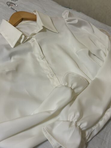 - Ağ, uzunqollu şifon köynək: klassik yaxalıq, düyməli ön hissə, yüngül və axıcı parça, manjetlərdə rezinli-fırfırlı bitiş.