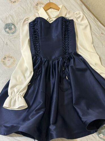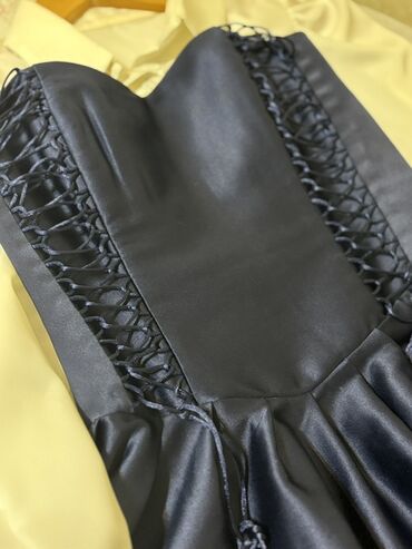- Tünd lacivərt mini paltar: atlas parça, ürək formalı korset tipli üst, ön hissədə iki tərəfli şəbəkəli-bağlı dekor, beldən aşağı həcimli ətək. Arxa hissədə gizli fermuar. Yanaqlarda tənzimlənən kordonlar.
