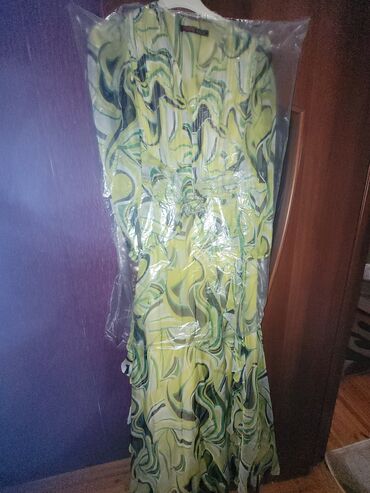 Uzun şifon geyim – limon-yaşıl rəngdə, romantik siluet. - Model: Uzun, axıcı ətəkli, yüngül və hərəkətdə dalğalanan şifon qatlı. - Yaxa və üst hissə: Elastik, yüngül büzgülü kvadrat/yaarım açıq de...