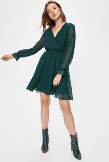 Şifon don – yaşıl rəngdə, xırda naxışlı. - Üst hissə kəsişən (wrap) formadadır - Çiyinlər pleçlidir - Uzunluğu topuqdandır - Uzun qollu, elastik manjetli - Arxa hissədə iplə bağlama detalı görünür ...