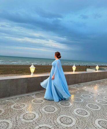 Şıq açıq mavi rəngli ziyafət/nahar donu. 2 ve ya 3 defe geyinilib - Model: A-kəsimli, dizdən bir qədər aşağı uzunluq - Parça: Yüngül, axıcı üst qat; alt hissədə zərif tor/şəbəkə (mesh) detalı - ...