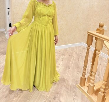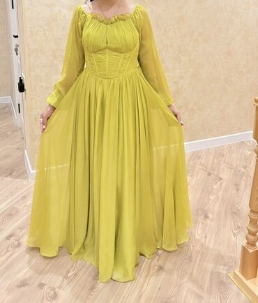 YaşılUzun şifon geyim – limon-yaşıl rəngdə, romantik siluet.