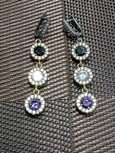 - Model 2: Uzun sallantılı sırğa. Üç mərhələli yuvarlaq elementlər: üst hissədə qara, ortada şəffaf, aşağıda bənövşəyi mərkəzi daş; hər biri ətrafı mikro zərif daşlarla çevrələnib. Qarmaq hissəsi də parlaq daşlarla işlənib.