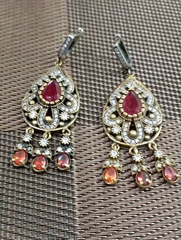 - Model 1: Şərq üslubunda damla formalı asimmetrik işləmə. Ortasında al-qırmızı damla daş, ətrafı xırda parlaq daşlarla bəzədilib. Aşağı hissədə üç ədəd sallantılı damla daş (narıncı-qırmızı tonlar) və ara hissələrdə kruqumsu brillant effektli daşlar. Antik qızılı və gümüşü rəng miksli metal.