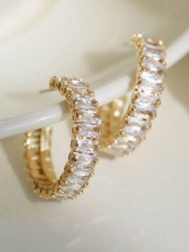 - Halqa sırğalar: Qızılı rəngdə korpus, çarpaz bəzəkli parlaq şəffaf daşlarla tam örtülmüş dizayn. Klassik halqa forması, işıqda yüksək parıltı effekti verir. Axşam və xüsusi dəvətlər üçün ideal.